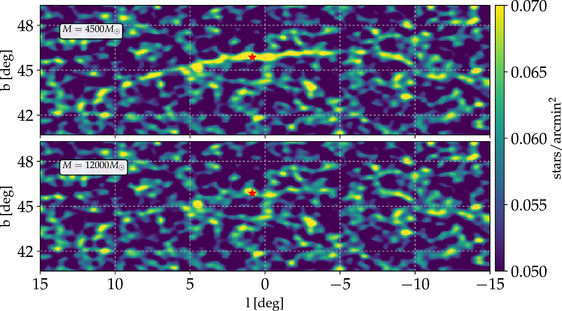 To assess stream detectability, Pearson et al. (2024) introduced a “streaminess” criterion based on two metrics. One is the angular distance between a stream’s center of mass and the Galactic center in Galactic coordinates: \[\Delta_0 = \sqrt{\mathrm{medn}(b)^2 + \mathrm{medn}(l)^2}.\] A small \(\Delta_0\) indicates the debris is symmetrically distributed about the Galaxy, and thus fully phase-mixed.
