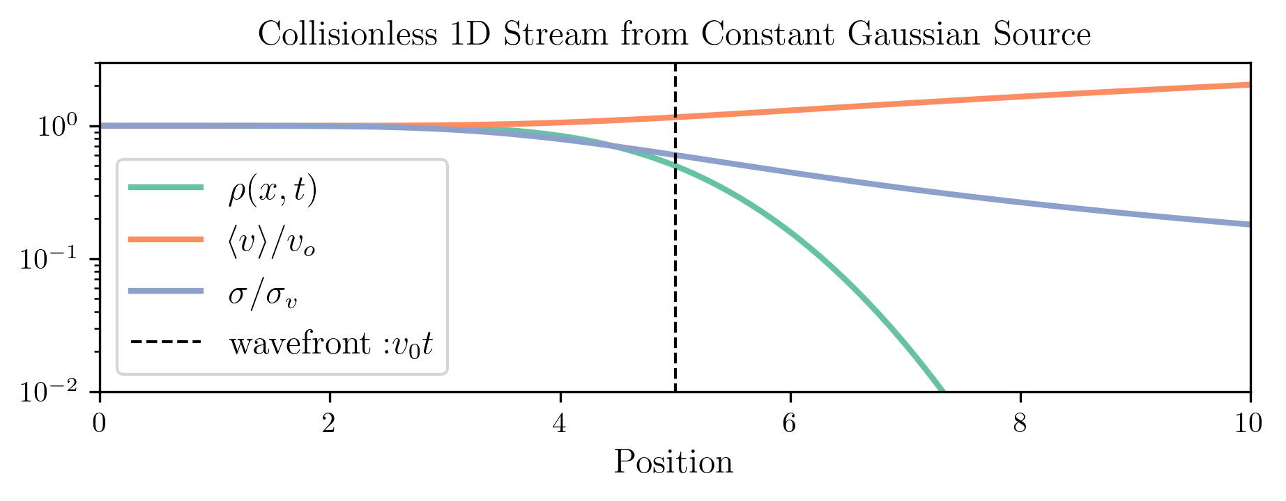 Using the method of characteristics, we find that \(f\) is constant along lines of the form \(x - vt = \text{const}\). This means we are solving a PDE in the \((x,t)\) plane for fixed values of \(v\). The initial condition implies that \(f=0\) in regions not yet reached by any particles — that is, wherever \(x/t > v\). Thus, the solution is: \[f(x,v,t) = \begin{cases} \mathcal{N}(v \,|\, v_0, \sigma_v) & \text{if } v > \frac{x}{t}, \\ 0 & \text{otherwise}. \end{cases} \label{eq:one_dimensional_collisionless_streaming}\] We can now compute the moments of this distribution. The density at each position is given by: \[\rho(x,t) = \int_{x/t}^{\infty} f(x,v,t) \, dv = \frac{1}{2} \, \mathrm{erfc}\left( \frac{x/t - v_0}{\sqrt{2}\sigma_v} \right),\] i.e., the integral of a truncated Gaussian. Similarly, the mean velocity and velocity dispersion at fixed \((x,t)\) are computed from the conditional distribution \(f(v|x,t) = f(x,v,t)/\rho(x,t)\), via: \[\begin{aligned} \langle v \rangle(x,t) &= \frac{1}{\rho(x,t)} \int_{x/t}^\infty v f(x,v,t) \, dv, \\ \langle v^2 \rangle(x,t) &= \frac{1}{\rho(x,t)} \int_{x/t}^\infty v^2 f(x,v,t) \, dv, \\ \sigma_v^2(x,t) &= \langle v^2 \rangle(x,t) - \langle v \rangle(x,t)^2. \end{aligned}\] Each of these integrals can be expressed analytically in terms of the error function and exponential functions, since they are the moments of a truncated Gaussian.