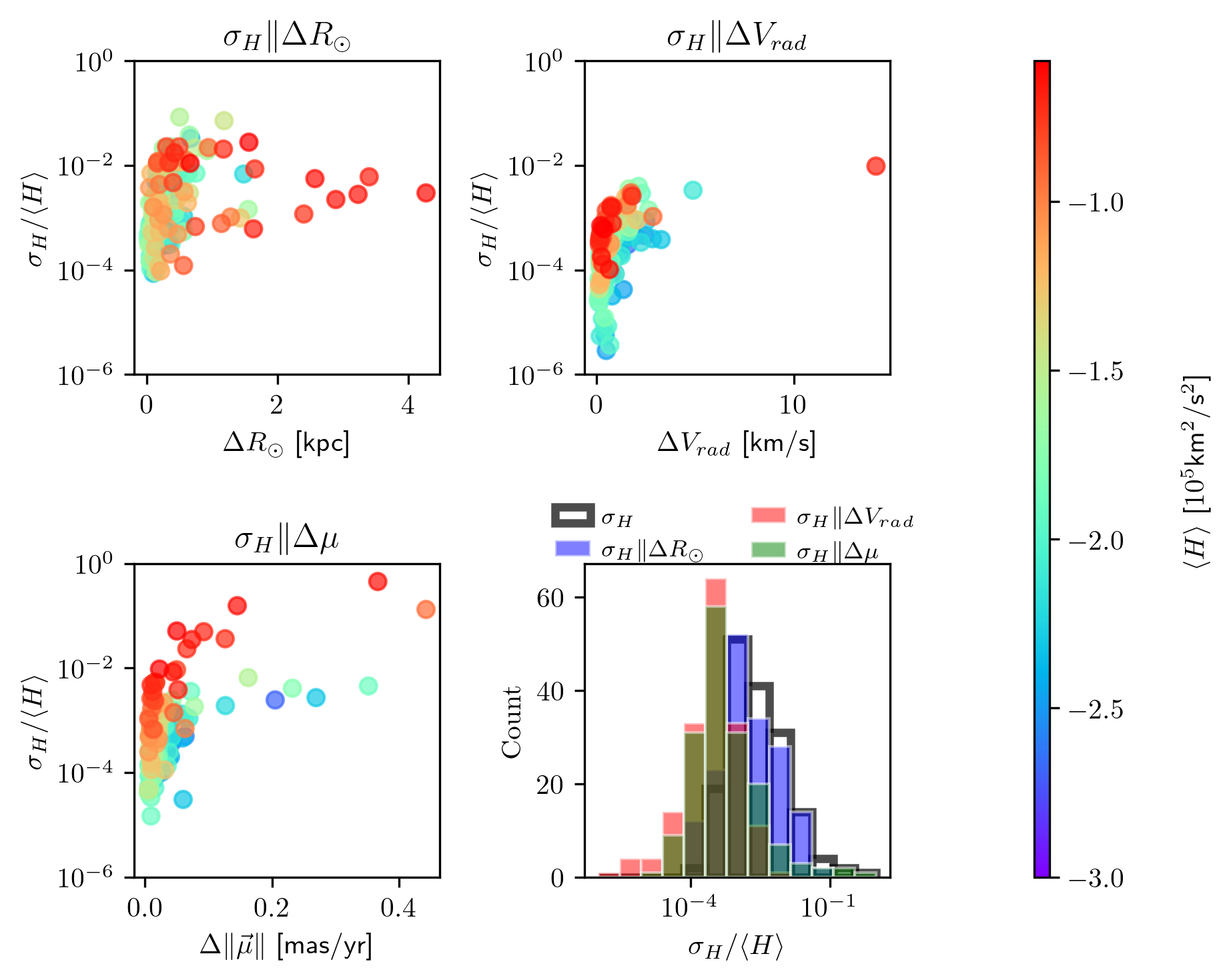 It is also informative to examine how uncertainties in orbital energy relate to uncertainties in the individual observables. In Fig. 18, I illustrate this with a simple calculation. The measurements of the globular clusters, along with their associated uncertainties, are reported in the ICRS. I sample the observables assuming Gaussian errors and transform the coordinates to the Galactocentric reference frame.