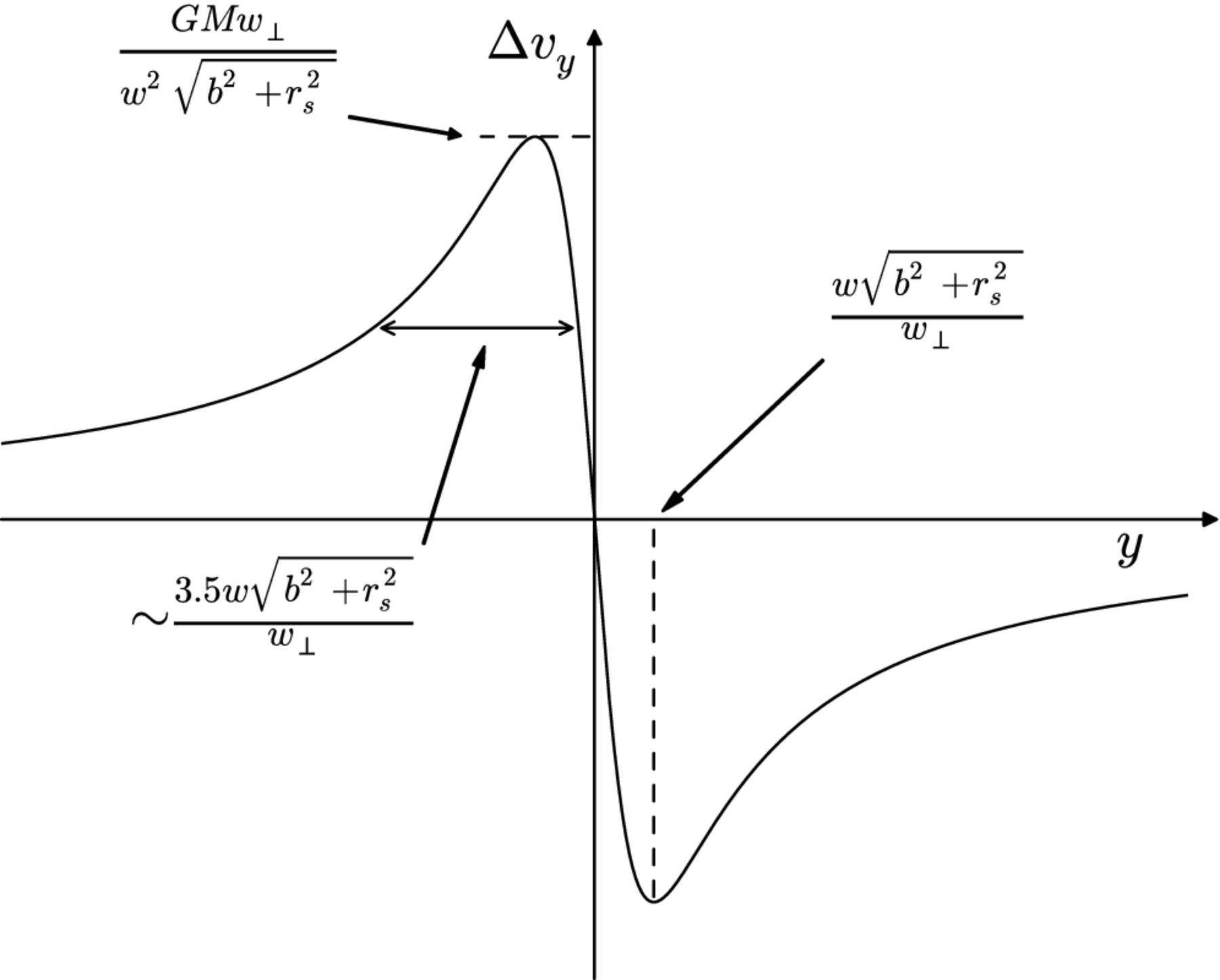 The expression for \(\Delta v_y\) is: \[\Delta v_y\left(y\,|\, M, r_s, b, w_\parallel, w_\perp\right) = - \frac{2GM w_\perp^2 y}{w\left[\left(b^2 + r_s^2\right)w^2 + w_\perp^2 y^2\right]},\] which is an odd function of \(y\), as expected for a gravitationally attractive force: stars ahead of the impact point (\(y>0\)) are slowed down, while those behind (\(y<0\)) are sped up.