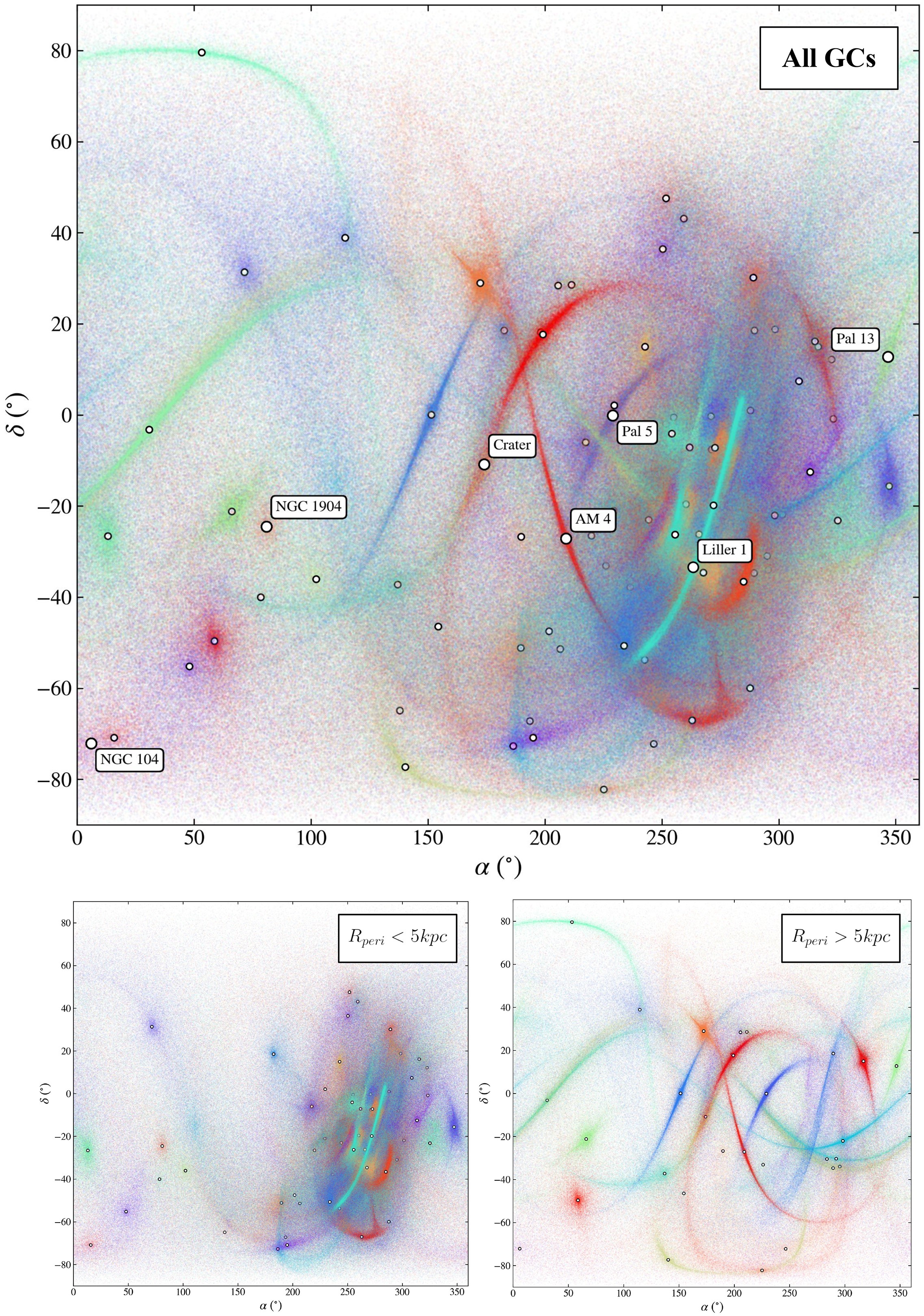 To estimate the full population of globular cluster streams, Pearson et al. (2024) used the IllustrisTNG simulations (Nelson et al. 2019), injecting globular clusters both formed in situ and accreted via dwarf galaxies following the prescriptions of Chen and Gnedin (2022, 2023). They then modeled the dissolution of these clusters and studied the resulting tidal debris. A panorama of their predicted streams is shown in Fig. 19.
