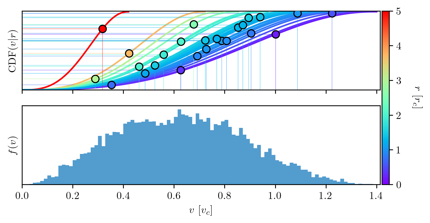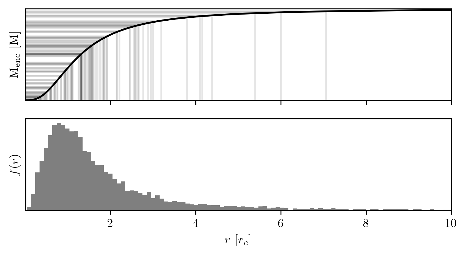 We have chosen the gravitational potential of each cluster to follow a Plummer sphere, as given in Eq. [eq:plummer]. The corresponding mass profile can be sampled to generate initial positions for individual particles. However, positional information alone is insufficient, we must also assign appropriate velocities. One crude approach, following the sampling of positions, is to assign a velocity vector drawn isotropically; that is, with a direction uniformly distributed over the sphere. Furthermore, the speed could be sampled uniformly between zero and the local escape velocity. While this method can produce plausible initial conditions, it lacks self-consistency, as the resulting phase-space distribution would not correspond to a stable equilibrium configuration of the chosen potential.