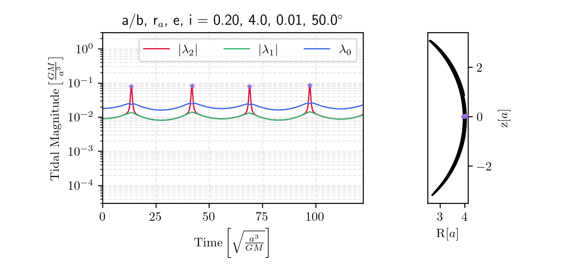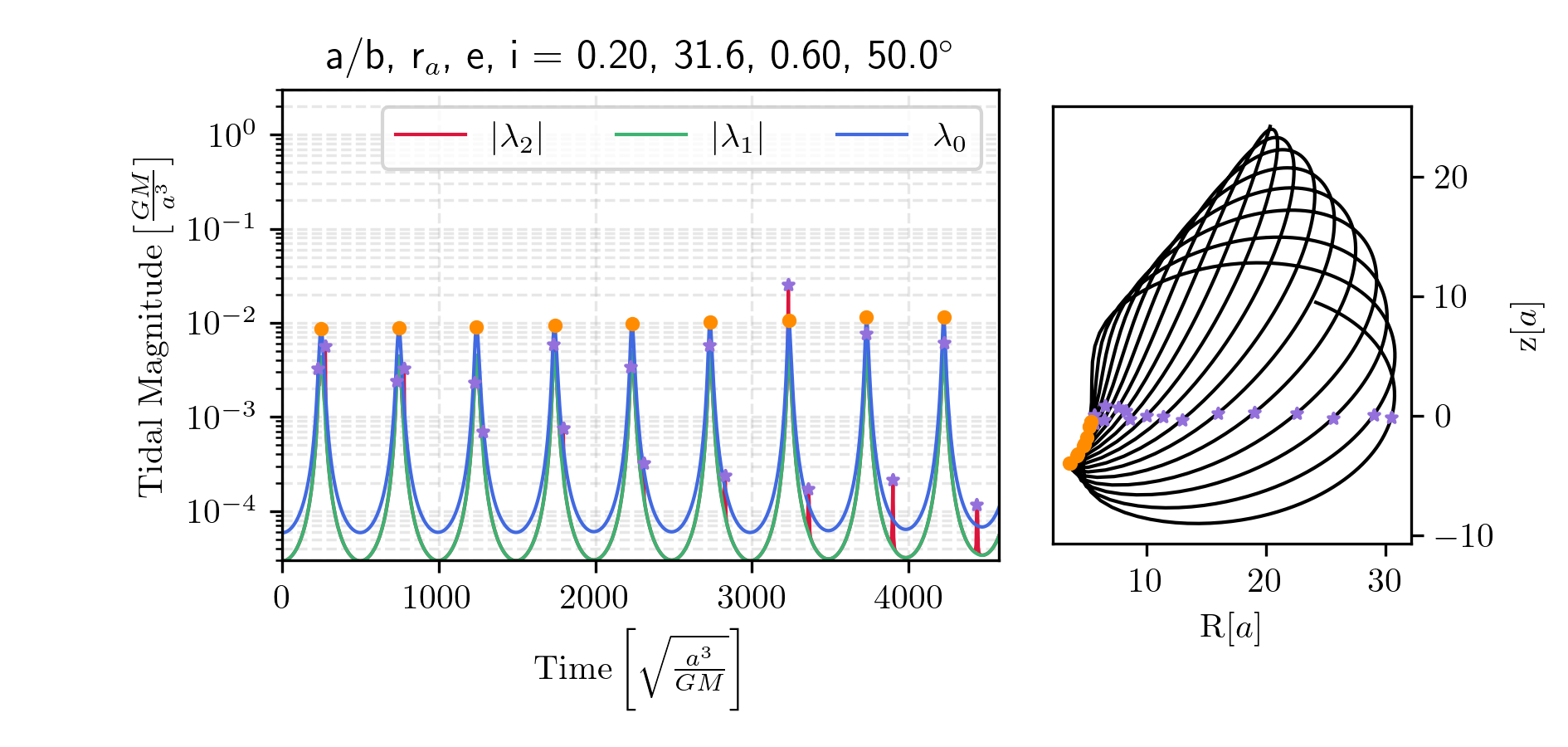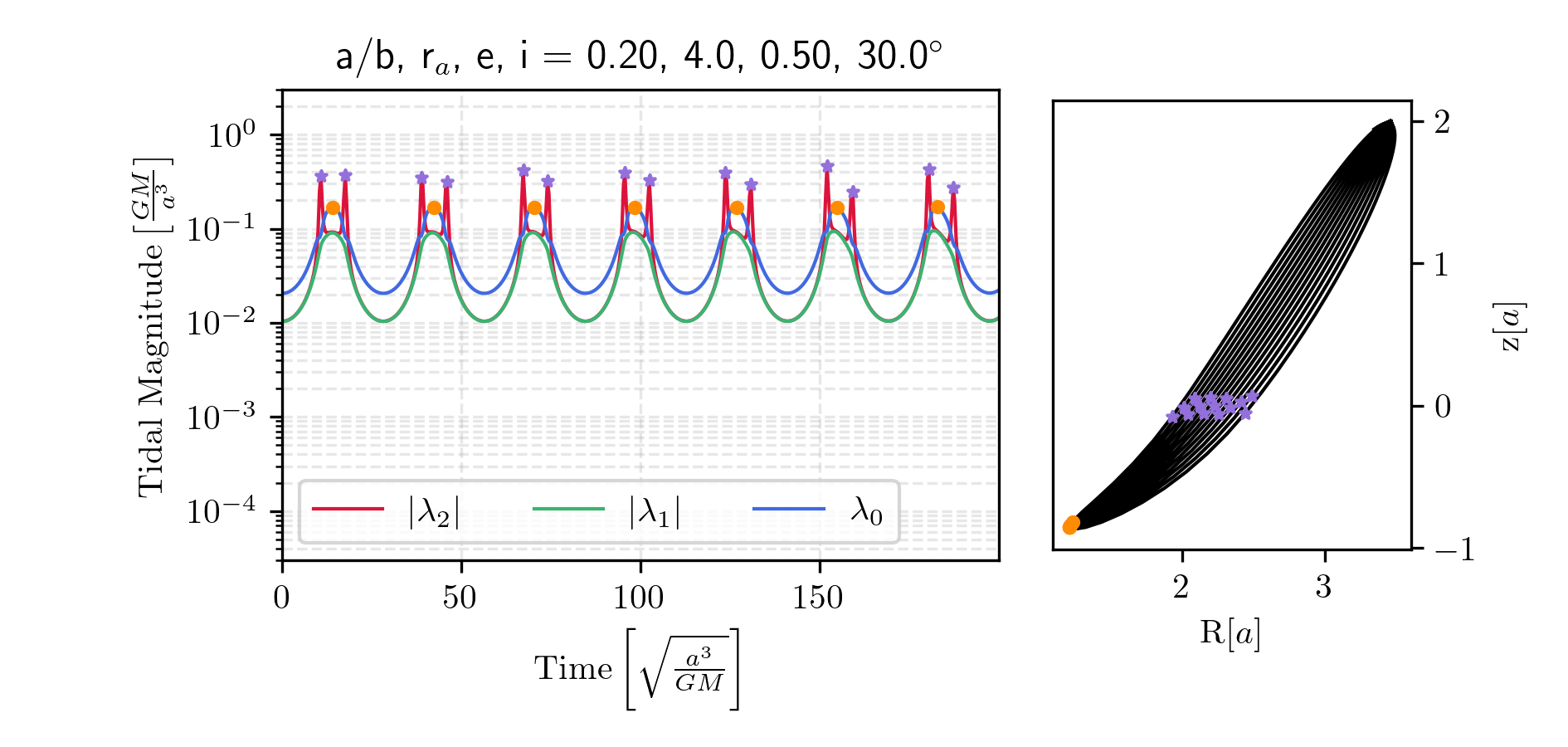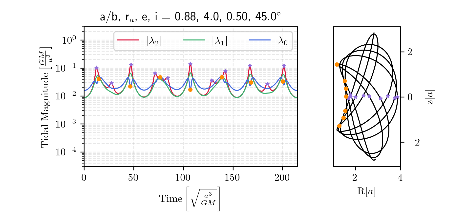 We can construct the tidal tensor for the Miyamoto-Nagai potential. First, it is convenient to non-dimensionalize the potential. Below, we normalize the potential by the total mass and gravitational constant, \(\Phi^\prime = \Phi / (GM)\), and each distance by the characteristic length of the disk, \(x^\prime = x/a\), \(b^\prime = b/a\). For clarity, we omit the prime notation in what follows. The dimensionless potential then becomes: \[\begin{aligned} \Phi &= \frac{1}{D},\\ D &= \sqrt{x^2 + y^2 + \beta^2(z)},\\ \beta(z) &= 1 + \sqrt{z^2 + b^2}. \end{aligned}\] The dimensionless tidal tensor is then: \[\mathcal{T}=-\frac{1}{D^3}\left(\begin{matrix} 1-\frac{3x^2}{D^2} & -\frac{3xy}{D^2} & -\frac{3x\beta \beta'}{D^2} \\ \dots & 1-\frac{3y^2}{D^2} & -\frac{3y\beta \beta'}{D^2} \\ \dots & \dots & \beta'^2 + \beta \beta'' -\frac{3\left(\beta\beta'\right)^2}{D^2} \end{matrix}\right),\] where \(\beta^\prime = \frac{d \beta}{dz}\) and \(\beta^{\prime\prime} = \frac{d^2 \beta}{dz^2}\). We immediately notice that, due to the cylindrical symmetry, the eigenvectors are not as simple as in the spherical case. As long as \[\beta'^2 + \beta \beta'' - \frac{3\left(\beta \beta'\right)^2}{D^2} \neq 1 - \frac{3z^2}{D^2},\] (1) the stretching axis is no longer parallel to the position vector, and (2) the compression axes do not necessarily lie in the same plane—they may instead be fixed in orientation and differ in magnitude. The exact orientation of all three eigenvectors depends on the cluster’s position in the galaxy. Note that if \(z = 0\), we recover the case where the stretching eigenvector is parallel to the position vector, although the compression axes remain unequal in magnitude and fixed in orientation. If instead \(b = 0\), then we recover spherical symmetry, and the compression eigenvalues become equal. I have prepared Figs. 9-13 to illustrate the diversity of tidal forces experienced by clusters on various orbits within a Miyamoto-Nagai disk potential. I generate initial conditions with prescribed pseudo-eccentricities and inclinations. Each initial condition is set at apocenter, specified by a radial distance and an inclination from the disk plane. The initial velocity vector is oriented perpendicular to both the z-axis and the position vector. The circular speed at the initial position is computed as \(v_\mathrm{circ} = \sqrt{|\mathbf{r}| \cdot |\nabla\Phi(\mathbf{r})|}\). The pseudo-eccentricity is applied via \(v_0 = v_\mathrm{circ} \sqrt{\frac{1 - e}{1 + e}}\).
