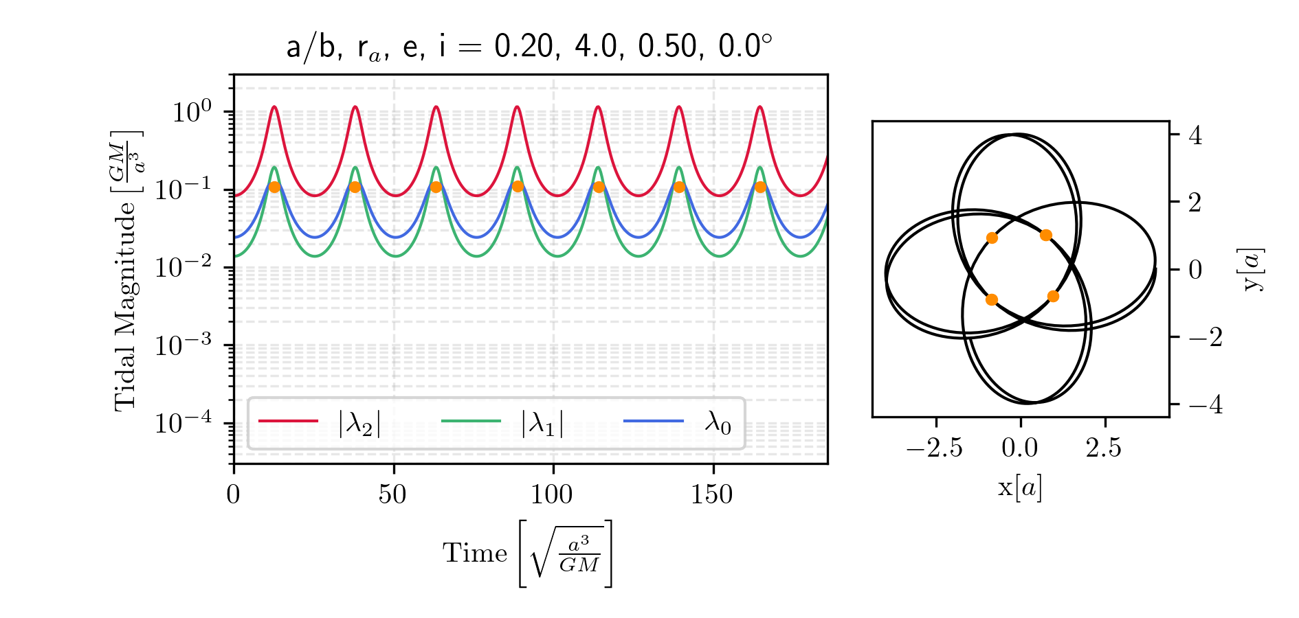 All of the above phenomena require using the tidal tensor for a Keplerian potential: \[\mathcal{T}= -\frac{GM}{r^3}\left(\begin{matrix} 1-\frac{3x^2}{r^2} & -\frac{3xy}{r^2} & -\frac{3xz}{r^2} \\ -\frac{3yx}{r^2} & 1-\frac{3y^2}{r^2} & -\frac{3yz}{r^2} \\ -\frac{3zx}{r^2} & -\frac{3zy}{r^2} & 1-\frac{3z^2}{r^2} \end{matrix}\right),\] which has eigenvalues \(2\frac{GM}{r^3}\), \(-\frac{GM}{r^3}\), and \(-\frac{GM}{r^3}\), with corresponding eigenvectors: \[\vec{v}_0 = \dfrac{1}{r}\begin{bmatrix} x \\ y \\ z \end{bmatrix},\quad \vec{v}_1 = \dfrac{1}{\sqrt{x^2 + y^2}} \begin{bmatrix} -y \\ x \\ 0 \end{bmatrix},\quad \vec{v}_2 = \dfrac{1}{r\sqrt{x^2 + y^2}} \begin{bmatrix} -xz \\ -yz \\ x^2 + y^2 \end{bmatrix}.\] Notably, the first eigenvalue is positive and corresponds to stretching along the position vector \(\vec{r}\). The other two eigenvalues are equal and negative, representing compression in the plane perpendicular to \(\vec{r}\). Any orthonormal pair of vectors spanning this plane forms valid eigenvectors, so the choice is not unique. In this work, we illustrate this by choosing \(\vec{v}_1\) perpendicular to both \(\vec{r}\) and the \(z\)-axis, i.e., effectively projecting along \([0,0,1]\), and taking the cross product to define \(\vec{v}_2\). This choice leads to a singularity when \(\vec{r}\) is aligned with the \(z\)-axis; in that case, any other reference axis can be chosen to define the perpendicular plane.
