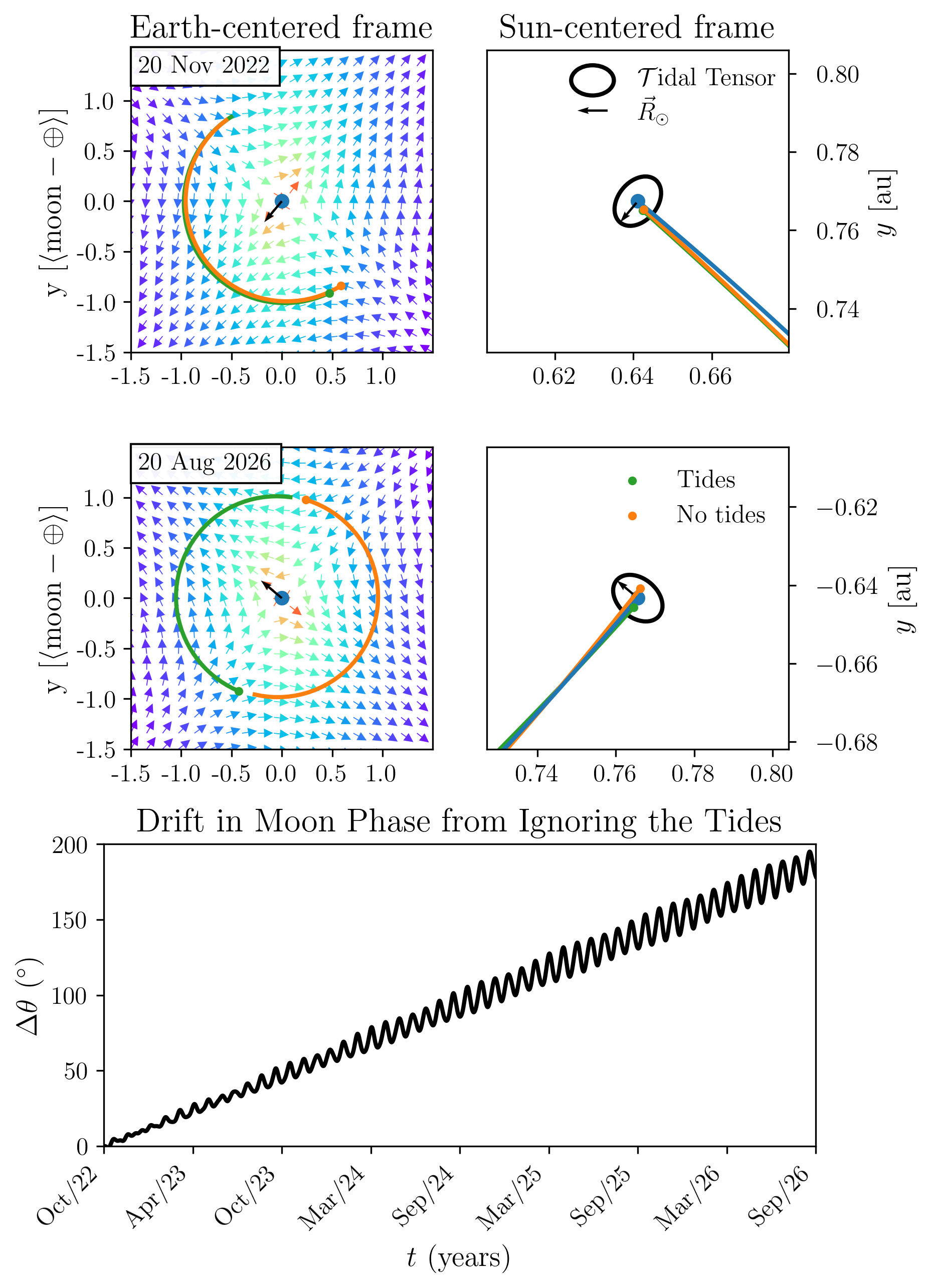 In the first scenario, the Moon’s motion is governed by the two-body Earth-Moon problem with a rotating reference frame correction: \[\ddot{\vec{r}} = -\frac{GM_\oplus}{r^3}\vec{r} - \omega_\oplus \times \left(\omega_\oplus \times \vec{r}_\oplus\right),\] while in the second, we include the effect of solar tidal forces: \[\ddot{\vec{r}} = -\frac{GM_\oplus}{r^3}\vec{r} - \omega_\oplus \times \left(\omega_\oplus \times \vec{r}_\oplus\right) -\frac{GM_\odot}{r_\oplus^3} \left(\begin{matrix} 1-\frac{3x^2}{r_\oplus^2} & -\frac{3xy}{r_\oplus^2} & -\frac{3xz}{r_\oplus^2} \\ -\frac{3yx}{r_\oplus^2} & 1-\frac{3y^2}{r_\oplus^2} & -\frac{3yz}{r_\oplus^2} \\ -\frac{3zx}{r_\oplus^2} & -\frac{3zy}{r_\oplus^2} & 1-\frac{3z^2}{r_\oplus^2} \end{matrix} \right) \cdot \vec{r},\] where \(r_\oplus\) is the Earth’s position relative to the Sun, \(\vec{r}\) is the Moon’s position relative to Earth, \(M_\odot\) is the mass of the Sun, and \(M_\oplus\) is the mass of the Earth. The coordinates \(x, y, z\) refer to the components of Earth’s heliocentric position.
