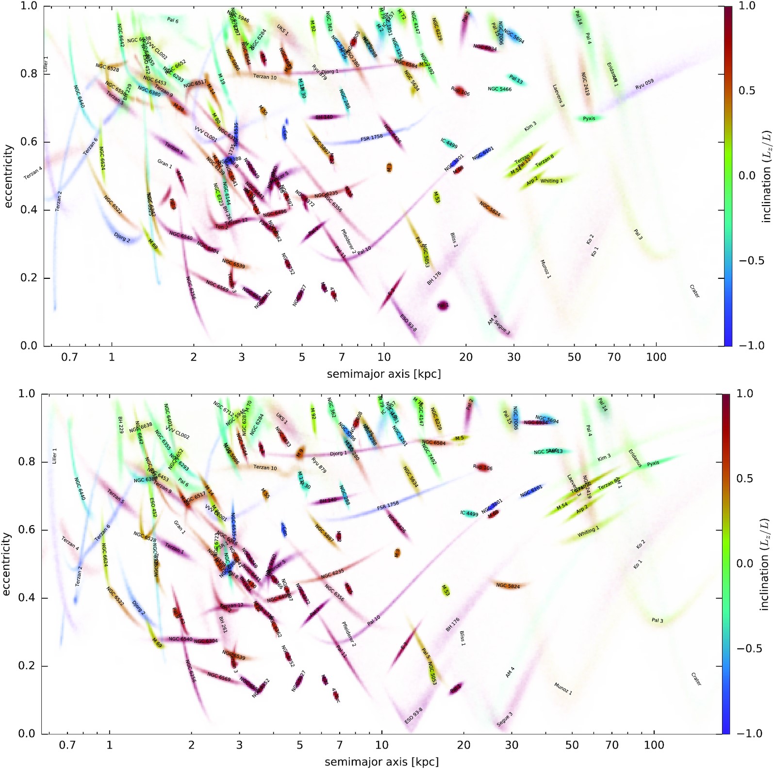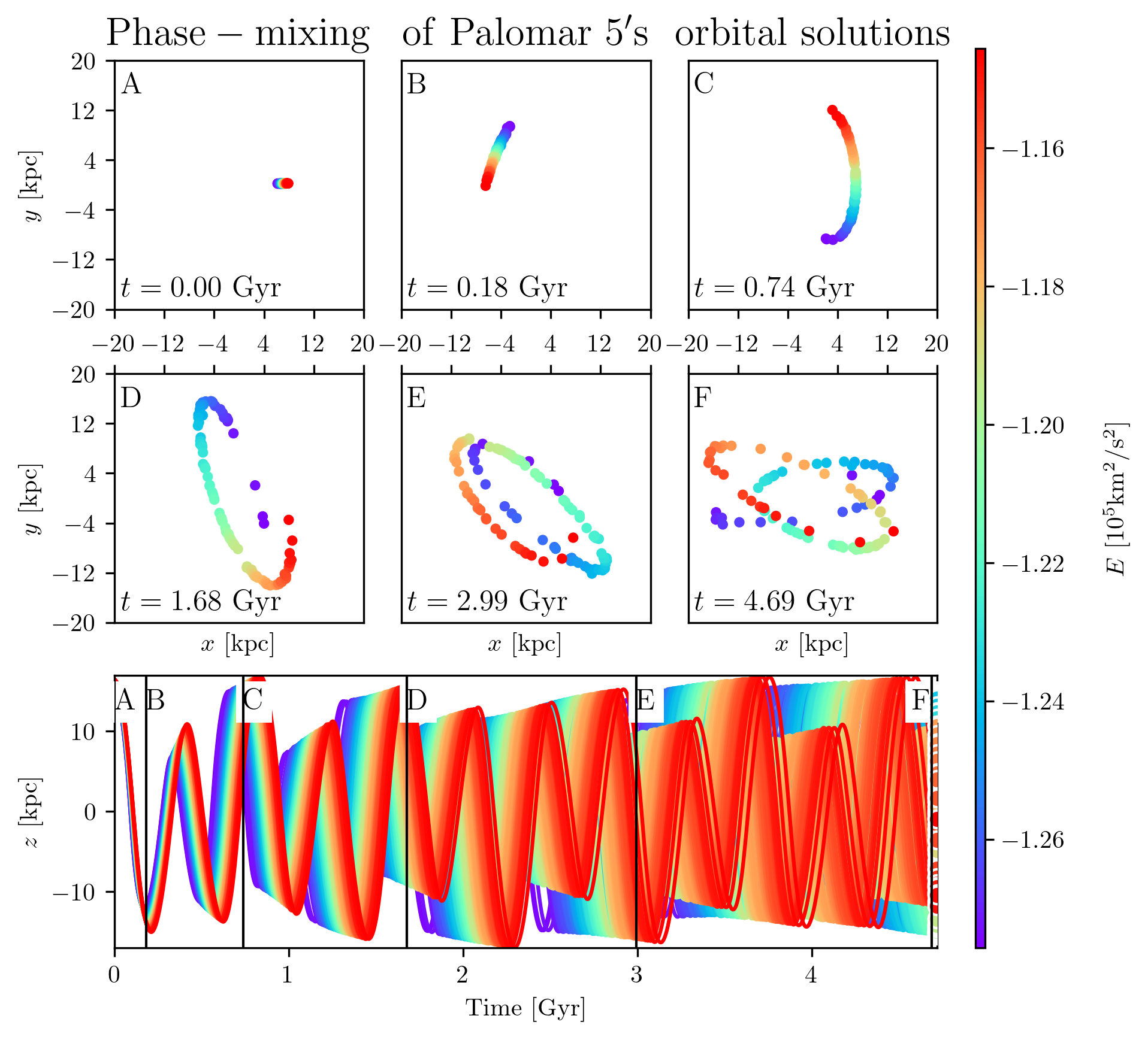 The first manifestation of phase mixing is the growth of uncertainty in orbital solutions for globular clusters over time. This originates from the initial spread in orbital energies caused by observational uncertainties. In Fig.16, I present an example based on Palomar 5, for which I compute 50 orbital solutions in our potential model. These initial conditions are sampled according to the uncertainties reported in the Baumgardt catalog. The figure shows that while the orbital solutions remain broadly similar, the lower-energy orbits progress through phase space more rapidly. In the bottom panel, the rightmost side includes overplotted dots indicating the final \((t, z)\) coordinates of each solution, illustrating that they span nearly the full range of \(z\) values allowed by the initial conditions. In essence, once the integration time exceeds the phase-mixing timescale, any individual solution becomes speculative: the system could plausibly occupy any location in phase space permitted by the initial conditions.
