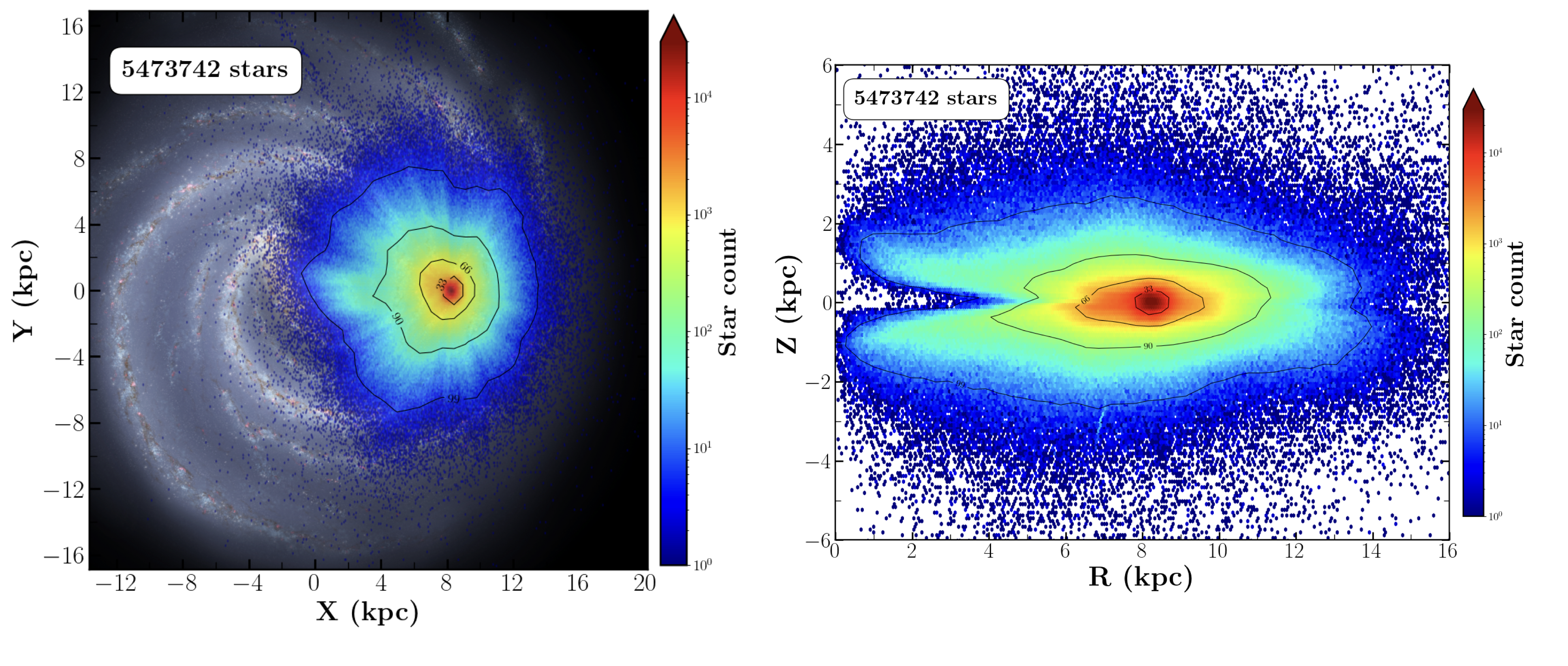 The challenge is compounded by limitations in the available data. The Gaia mission has delivered the most comprehensive survey of the Galaxy to date (Gaia Collaboration, Vallenari, et al. 2023), providing photometric and astrometric data for over two billion stars and radial velocities for tens of millions (Gaia Collaboration, Katz, et al. 2018). However, this still represents only a small fraction of the total stellar population. The stellar mass of the Milky Way is estimated to be approximately \(6\times10^{10} \mathrm{M}_\odot\) (Licquia and Newman 2015), corresponding to roughly one hundred billion stars (see also McMillan 2017). Thus, Gaia provides 5D phase-space information for only about 1-2% of all stars, and full 6D information for just a fraction of a percent.