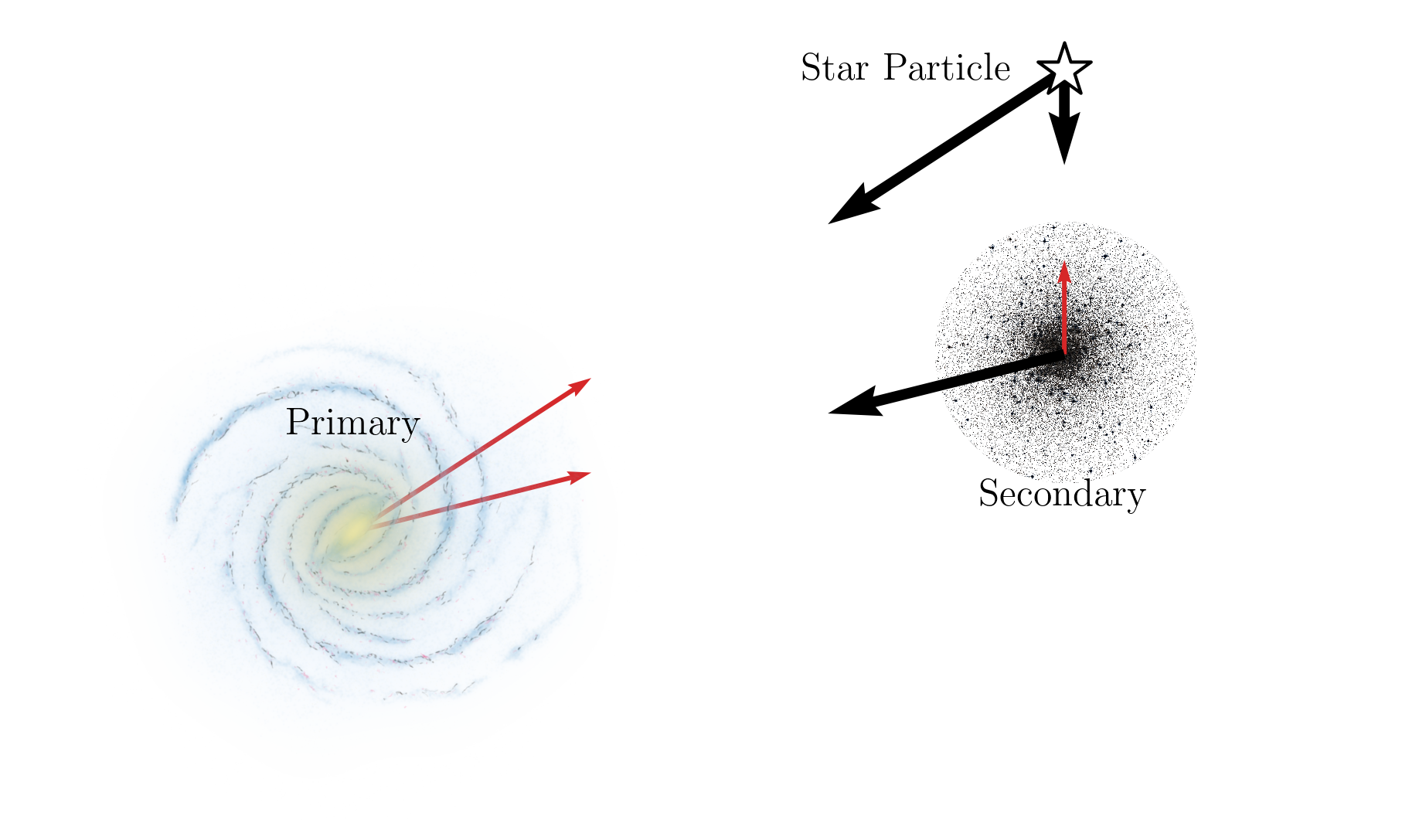 To make the problem computationally tractable, we model the stars as test particles – massless bodies that feel the gravitational potential but do not contribute to it. The Galaxy and the globular cluster are each represented as smooth, time-independent density distributions. In this approximation, the stars do not interact with one another or with the cluster, and their trajectories are determined solely by the external potentials. This setup is a version of the restricted three-body problem, in which the Galaxy acts as the primary body (fixed at the origin), the globular cluster as the secondary (modeled by its center of mass), and the star as the tertiary object. This is shown in Fig. 1.