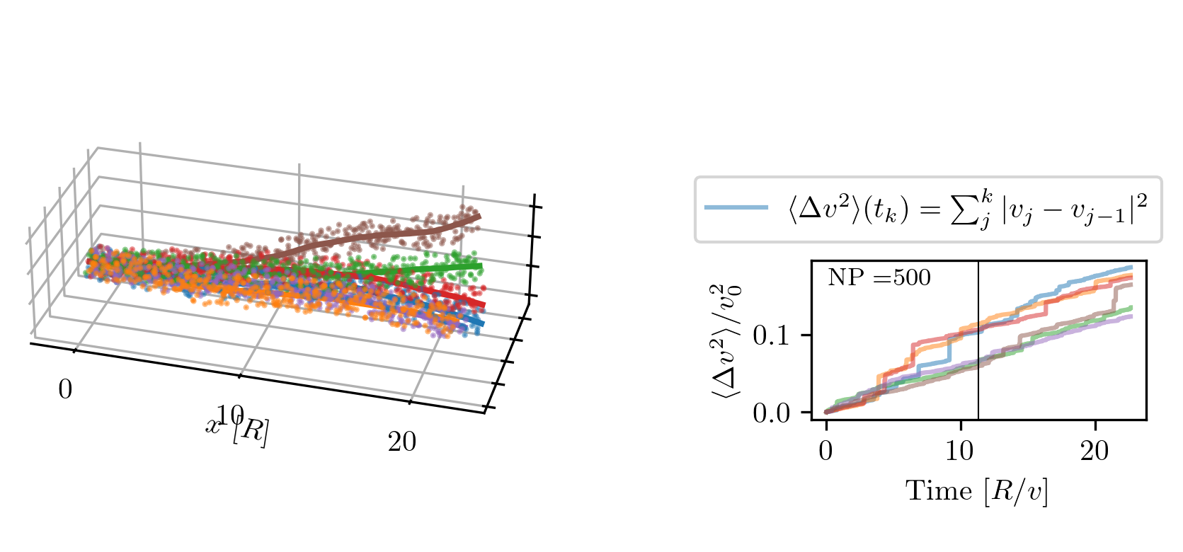 To simplify further, we idealize the galaxy as a cylinder of radius and length \(R\), with uniform number density \(n = N_p / (\pi R^3)\). As the star moves through this medium, we apply Eq. [eq:delta_v_vec_impulse_approx] to compute cumulative velocity kicks. This is demonstrated numerically in Fig. 22.